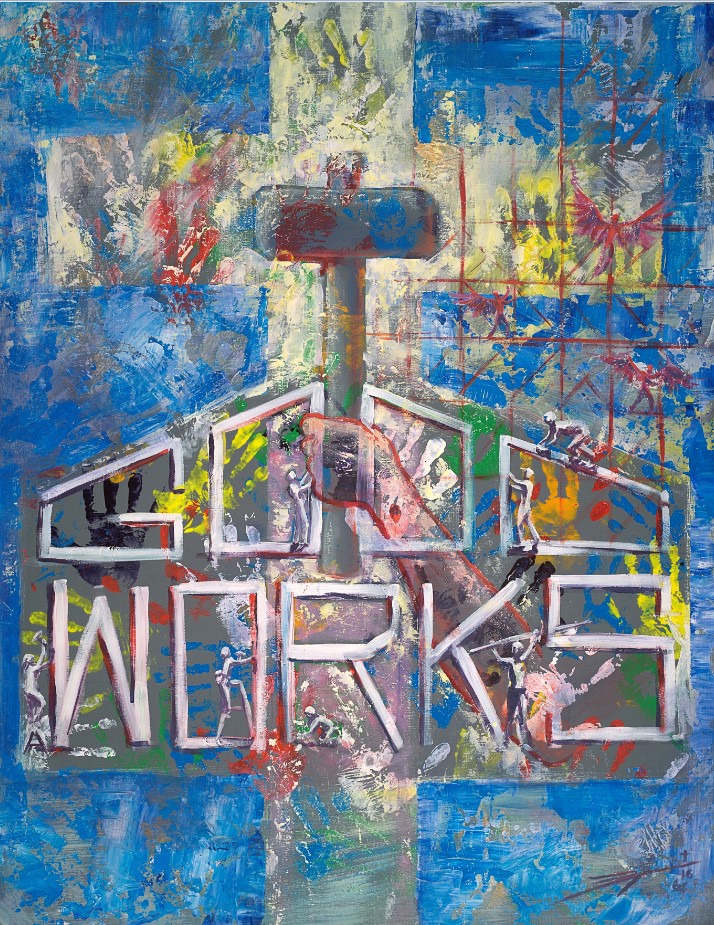 The painting has three levels beginning with a foundation of hands of service surrounding the Good Works logo. Reaching through the logo is the Savior’s hand, grasping a hammer – the tool of the carpenter, the tool used at the cross to assure our salvation, and today the tool we used to repair your home. The scaffolding with the angels connotes the spiritual realm of God’s kingdom as Jesus works through volunteers’ hands to bring His joy and His peace and His hope to everyone involved.
